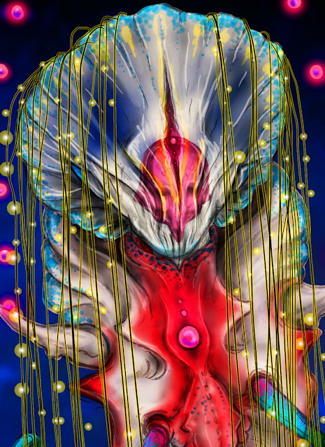 My concept: While I have to stand strong by my FXU prof, Stella, her and Jasmine had a tough time with that helmet jelly, so I wanted to take a stab at it. I love how it has that distinctive red organ shape inside of its translucent body, along with lots of bioluminescence. I also read that most of them swim upside down with their underside towards the surface, so I wanted to pull that into my design to create an interesting cowl and silhouette.